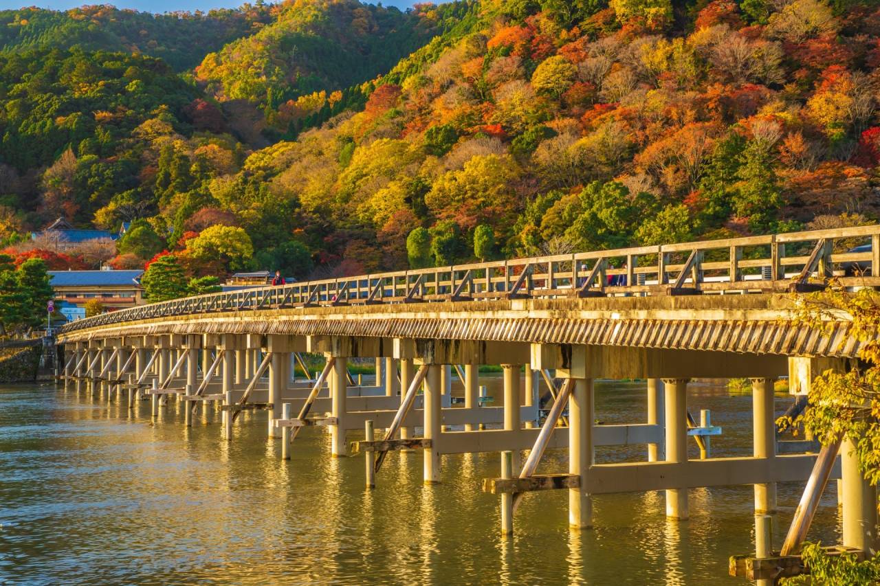 秋、嵐山は一年で最も美しい季節を迎えます。山々は赤や橙、黄金色に染まり、渡月橋や川の水面に映る紅葉が、まるで一幅の絵のような風景をつくり出します。
